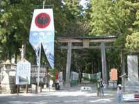 鳥居の前に立つと、大きな八咫烏(やたがらす)の幟が目を引く。八咫烏は熊野権現の使いで三本足の烏。日本サッカー協会のシンボルマークでお馴染みのもの。