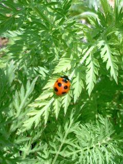 余談ですが、てんとう虫のとまっている野菜はニンジンです。ニンジンの葉っぱも美味しいのですよ。
