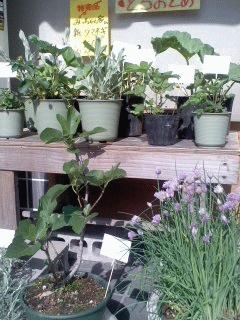 チャイブ、サントリナ、一才いちじくの鉢物です。