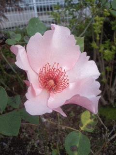 淡いピンクの一重咲きの薔薇・ディンティ・ベスが咲いてます。葉に黒斑が現れたので殺菌しました。