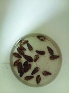 昨日、紙コップに朝顔の種を入れ、水に浸して置いたら、さっそく根がでました。