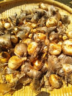 風通しの良い日陰で干し、土の付いた外皮を剥いて、晩夏の植え付けに備えます。