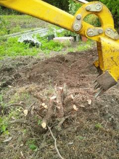 写真は移植先の畑に元々あったヒバを根元で切って、その切り株をマイクロショベルで掘り起こしているところです。このヒバ、あと30本くらいあります。