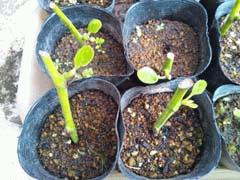 切ったイチジクを一晩水に浸し、発根促進剤を付けて、ポリ鉢に挿し木。