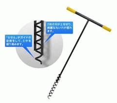 中古ビニールハウスの19mmパイプを差込む穴で深さは50cm、穴掘り器を時計回りにグイグイ回転させます。何が大変かというと、抜くときです。反時計回りさせながら引っ張るのですが、かなり腰にきます。