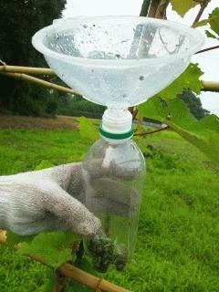そこで一番シンプルな方法を採用、ロートをペットボトルに挿しただけ。葉上のコガネムシを突くとポロッと落ちるので、それを回収します。とても簡単です。