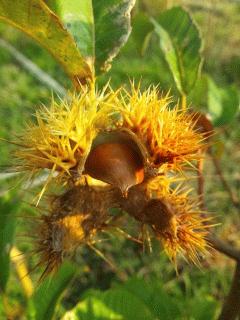 まだ樹が小さいので収穫せずに放置していた山栗(柴栗)、イガが裂けて実がこぼれてます。