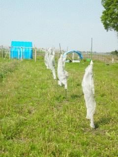 去年、食害にあった西洋梨、クッキングアップル、幼い苗を寒冷紗で覆って保護しました。