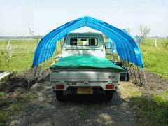 強い陽射しで軽トラの座席に置いてある電子機器類が心配なので、作業用ハウスを解体・移設です。