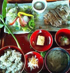 知人のお店がオープンしたのでお祝いを兼ねて食べてきました。地元で採れた新鮮な野菜、野草を使った料理メニューになっています。私は麹漬けポークソテーを注文しました。食前にはなにやら発酵させたジュースが出てきました、とても体に良さそう。ミョウガ竹や、たまご焼きの上にはカラスノエンドウの小さな豆も添えてあります。サラダはおからバーニャカウダです。食後にはこんにゃくのわらび餅と焦し玄米茶も付いてきました。