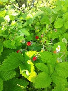 このフレーズデボア(森の苺/Fraise des Bois)は2014年4月に播種したもので、2年掛かってやっと群生してきました。こうなると他の雑草と対等に勢力争いしています。アメリカハナノキの株元の一群は木陰ですが、もう一群は温室の北側に生育しているものの割と直射日光もあたるのでそのうち簾でもしてあげようか・・・