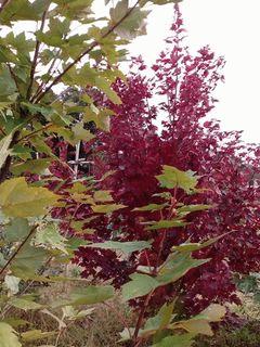 幻燈農場のヤマブドウのアーチを入ったところにアメリカハナノキがあります。2013年12月に購入して3年、私の身長を超え、高さ2m以上に生長しています。品種は「オクトーバーグローリー」です。写真手前もアメリカハナノキで品種不明ですが、こちらは黄色に色付くタイプのものです。