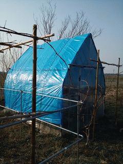このところ色々と播種しているのですが、発芽したばかりの苗には陽射しが強過ぎ、温室内は暑さで土が乾燥してしまうので、ブルーシートを掛けました。これで陽射しは穏やか、ほんのり暖かい感じになっています。