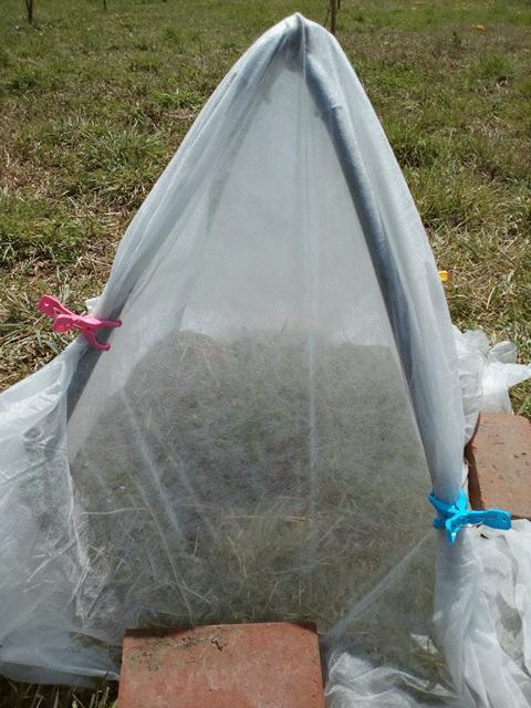 このところ色々と播種しているのですが、発芽したばかりの苗には陽射しが強過ぎ、温室内は暑さで土が乾燥してしまうので、ブルーシートを掛けました。これで陽射しは穏やか、ほんのり暖かい感じになっています。