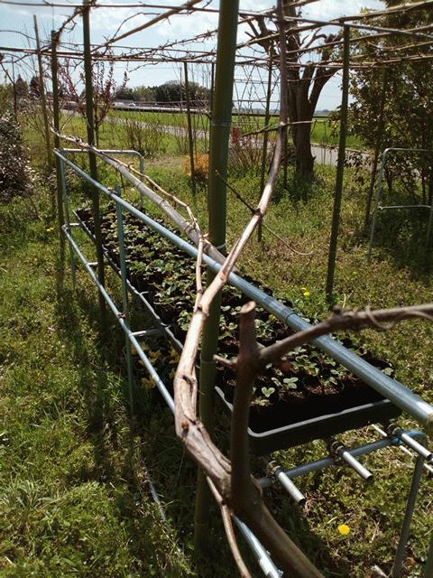 ちょっと前に株分けしたフレーズ・デ・ボア用に棚を作りました。苺には真夏の直射日光はきつ過ぎます。そこで、ぶどうに日除けしてもらって、ぶどう棚の下に苺の棚を設けました。