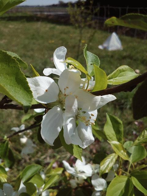 ドルゴ(ドルゴクラブ)はヨーロッパ原産のクラブアップルで、自家結実性があり、直径5cm程度の実を付けます。2014年の12月に苗を購入して2年ちょっとで開花です。本来、生育旺盛のようなので、早く成長して私の農園に夏の暑さをしのげる木陰を提供して欲しいものです。
