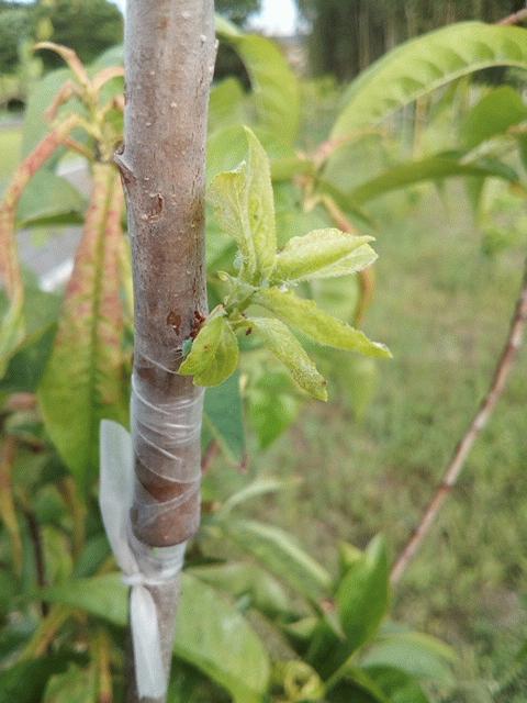 台木には野生桃台、穂木にプルーンの休眠枝を使って枝つぎしました。プルーンは開花と新葉の展開が同時期なのですが、花が散っても発芽せず、駄目かと思っていたら、ようやく新葉が展開してくれました。穂木は去年購入したプルーン苗の上部をカットして使っています。接ぎ木苗本体に比べて、枝つぎした野生桃台のほうが初結実が早いかもしれません。