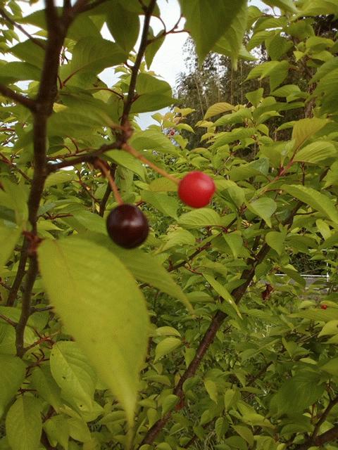 巴波桜に直径10mm程のサクランボが成りました。暖地桜桃よりも早く熟しています。左側の黒玉は完熟していて甘く、右の赤玉はまだ酸っぱいです。まあ普通のサクランボの味ですが、可愛らしい実なのでスイーツの上に乗せてもよいかもしれません。鳥に発見される前に収穫しなくては・・・