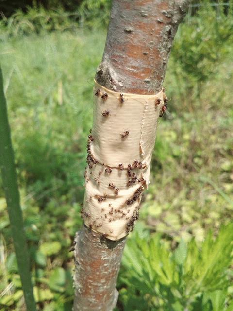 そこでまずは樹に登ってくる蟻の妨害工作です。その方法はとても簡単で布製のガムテープを裏返しにして粘着面を表向きにして樹に貼り付けるだけです。雨が降ると粘着性が弱まるので交換しましょう。