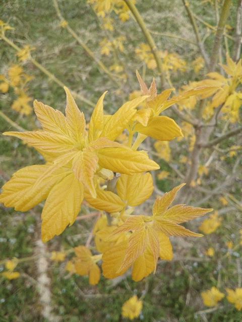 ネグンドカエデ「オーラタム」です。新緑の季節に黄金に輝いているので、とても目立ちます。この品種は樹高3~4m程度なので、庭木にもよいかもしれません。