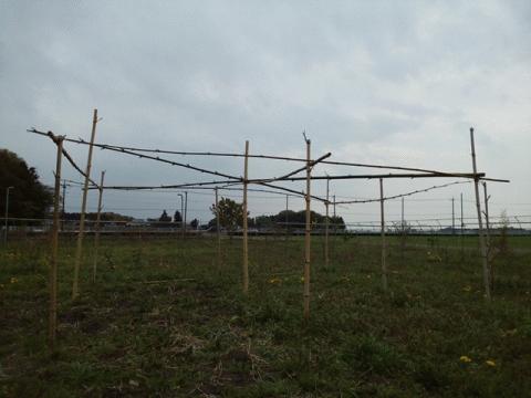 昨年は、横着して地這いにしてしまった為、雑草に塗れ、生育不順でした。ことしは雑ではあるけど、資材費ゼロでさっさと組み立てました。棚の上部に細い竹で格子を作れば完成です。脆そうにみえますが、経験上これでもかなりの耐久性があります。太い竹を使用すると自重で倒れたりするのですが、これは台風が来ても揺れはするけど大丈夫です。種もそろそろ蒔くことにしよう。