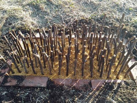 きょうは昨年剪定して保管しておいたヤマブドウ・紫紺のしずくを挿し木しました。今年はできるだけ手間を省くために、浅めに穴を掘って、レンガで囲い、鹿沼土細粒を敷いて挿し木することにしました。これで土壌が乾燥しなければ、水やりの時間が削減されます。挿し木というと直射日光の当たらない場所が定番ですが、ヤマブドウはかなり強いので大丈夫かもしれません。