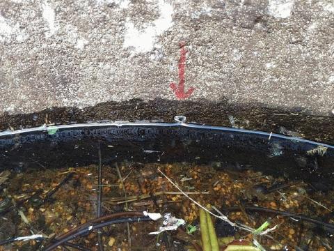 ここで、最新ハイテクパテ「LOCTITE(ロックタイト)多用途補修パテ プチ」の登場です!このパテ、水の中でも固まる優れモノです。一応、穴の下まで水位を下げ、釜の外側から塗り付けました。速硬化タイプのパテなので、練り合せ後3分以内に手際よく作業をこなす必要があります。実用強度に達するのが15分後、最終強度は24時間なので、明日になってから、スイレンに必要な水位15cmまで給水する予定です。