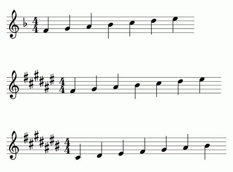 長音階を自動で算出するプログラムを書いたときのお話です。通常#の調号をもつ長調は、への音の位置から始まって、5つ上の音に移動しながら#を1つずつ増やしていきます。主音を探すときは調号の一番右の#が導音となるので、次の音が主音というわけですが、プログラムでは素直にハ長調から初めて、1度増やしながら長音階を算出する方法で考えてみました。すると、ラに#の付いた長音階が出現したのですが、長音階で該当する調がない!実はこれへ長調で、シに♭が付いたものと同一です。では、なぜこれが長音階に存在しないかというと、ラに♯を付けると幹音のシが存在しなくなってしまうのです。つまり、ラに♯を付けると、ドレミファソララ#ドとなる。シに♭なら、ドレミファソラシ♭ドとなるんです。さらに、嬰へ長調と嬰ハ長調に至っては、ミ#ってミの次は黒鍵ではなく白鍵のファ、シ#も普通にドの音です。これをプログラムで書くと例外処理(条件分)を施すことになります。こんな難解な調号を使わずに嬰ハ長調なら異名同音の変ニ長調(♭5個)にしなかったの?とも思ってしまいます。