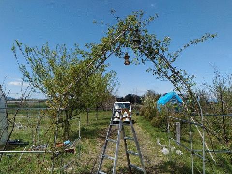 昨日の強風で、農園東側アーチに絡ませているバラが垂れ下がってしまったので、誘引・補修していました。