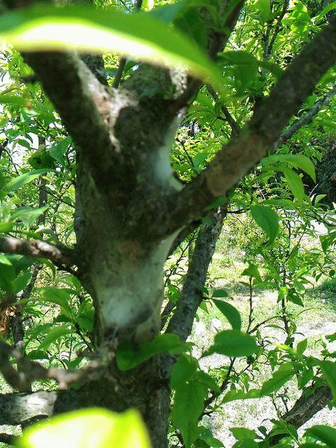 花が咲き終わり、葉が伸び始めた頃、梅やスモモなどの枝の分岐点に、白い糸の塊ができることがあります。。