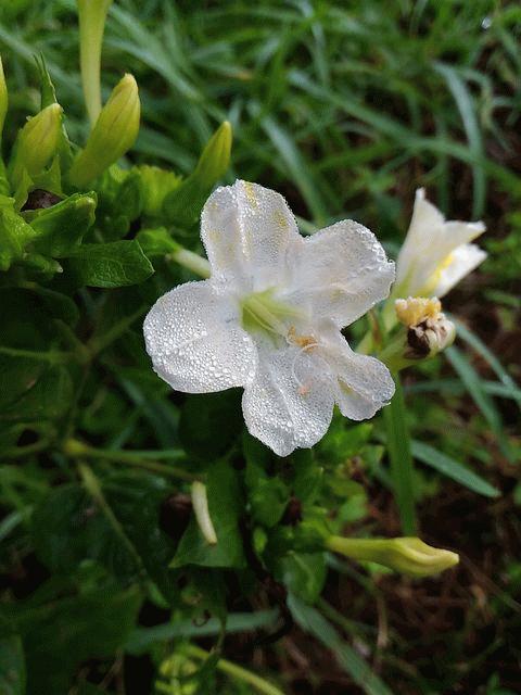 きょうの最高気温の予想は34℃、そんな中で農作業すると、熱中症であぶない。日の出は4時57分。早々に農園に出向くと、東側のエントランス脇のオシロイバナが迎えてくれました。写真では分かりずらいのですが、白に小さい黄色のマーブルのはいった珍しい品種です。草払いを1時間ほど行い、早々に撤収です。