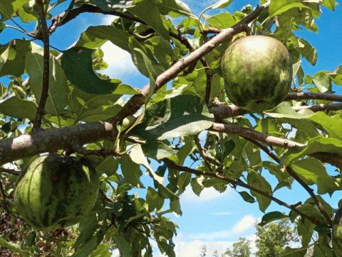 幻燈農場は農薬散布しないので、すす病で表皮が黒ずんでしまいます。すす病はカイガラムシ類の排泄物を養分に雑菌が繁殖したもので、こすると汚れは落ちて、きれいな緑色の表皮が現れます。このグラニースミスはクッキングアップルで、酸味が強い品種ですが、アップルパイにするととても美味しいです。