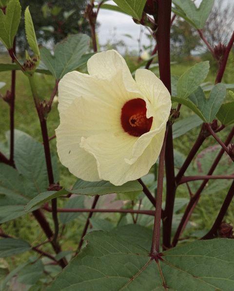 今年は収穫できますように! ローゼルの開花です。早咲きの品種なども試したのですが、実が熟す前に霜にやられてしまっています。今年こそは収穫して、ローゼル・ティーを楽しみたいものです。