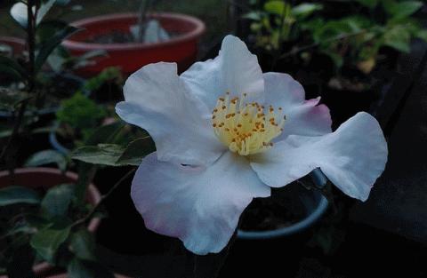 公園に咲いていた山茶花に惚れ込み種を採取、それから四年、やっと花が咲きました。