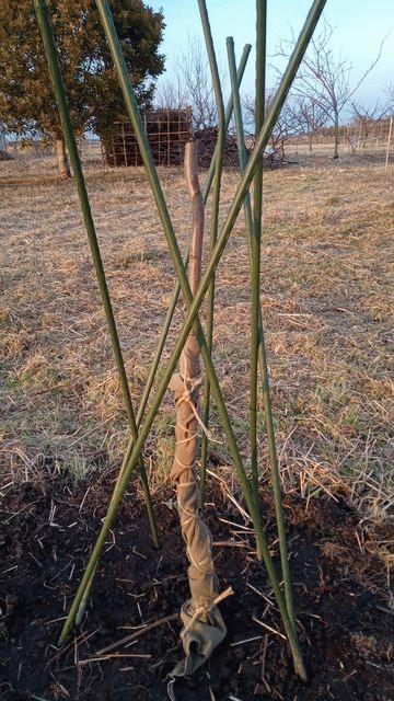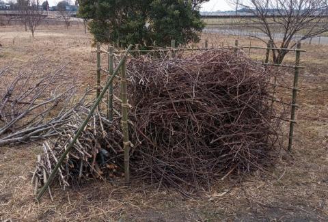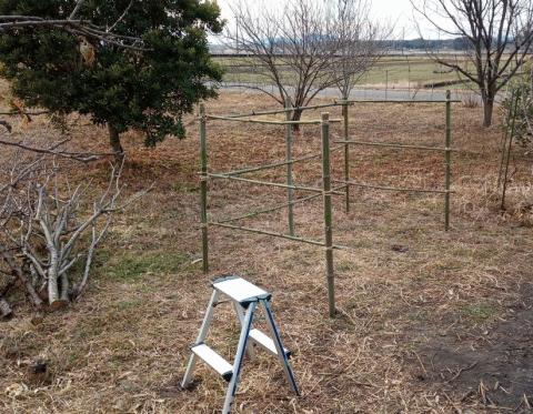 先日、剪定枝などで焼いたサツマイモがとても美味しかったので、枝を無駄に焼却するのはもったいない。そこで、隣接する竹林から竹を切り出し、剪定枝置き場を作ることにしました。きょうは時間がなかったので骨組みまでです。こういうものを作ると、農園らしさが増してくるように思えます。