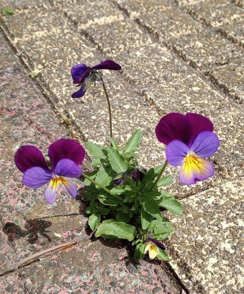 遊歩道のコンクリートの隙間から、ビオラが花を咲かせました。庭の植木鉢に咲いているものと同じですが、こぼれ種にしては、どうやってここまで辿り着いたのか、謎は深まるばかりです。