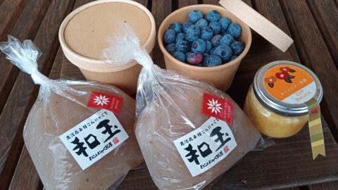 ブルーベリーの季節です 幻燈農場のブルーベリーもいよいよ収穫シーズン到来です。まずは日頃お世話になっている方々に感謝を込めて、一足早いお中元です!今回は仕事仲間のおこんにゃく茶屋の玉こんにゃくと柚子胡椒をセットにしています。この玉こんにゃくは、こんにゃくの生芋をすりおろし、天然の灰汁で固めるといった手の凝った一品です。このこんにゃくを薄くスライスして刺身こんにゃくにして、柚子胡椒とお醤油を付けていただきます。凝固剤を使ったこんにゃくでは味わうことのできない最高の食感です。