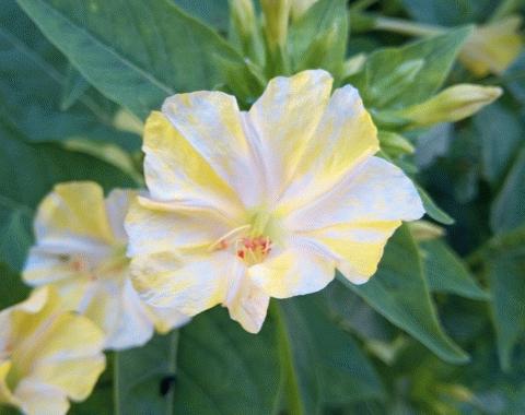 実は貴重なオシロイバナ 猛暑の折、農作業を早朝モードに切り替えたのですが、そうすると昼間には見ることのない日常がそこにあります。オシロイバナは、Four o'clock とも呼ばれ、夕方の四時頃から朝まで花を咲かせています。そして、幻燈農場に咲いているオシロイバナ、すごく珍しいのです。白と黄色のスプリット、さらに白の花びらに黄色のマーブルが混じっています。これがとても可愛らしくて美しい。今年は種採りをして、来年は鉢植えにもしてみよう。