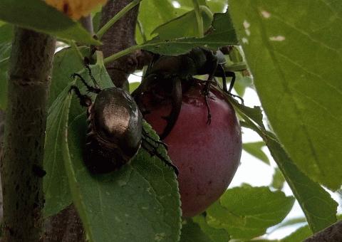 プルーンの収穫とグルメなクワガタ 2016年12月に苗を定植して5年半、やっと収穫できるようになりました。6月後半の35℃付近までの気温上昇で、灰星病の菌の活動が停止し、7月初旬から熟し始めた果実はなんとか被害を免れました。そしてその恩恵に与かったのが、美食家のクワガタです。