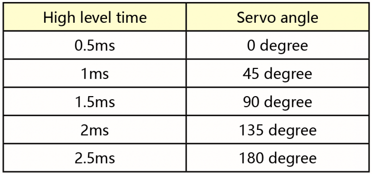 サーボモーターの回転角度は、PWM(パルス幅変調)信号のデューティサイクルを調整することで制御されます。PWM信号の標準周期は20ms(50Hz)です。理論上は1ms~2msの範囲で動作しますが、実際には0.5ms~2.5msの範囲です。このデューティサイクルは、0°~180°の回転角度に対応します。ただし、異なるブランドのモーターでは、同じ信号でも回転角度が異なる場合がありますのでご注意ください。