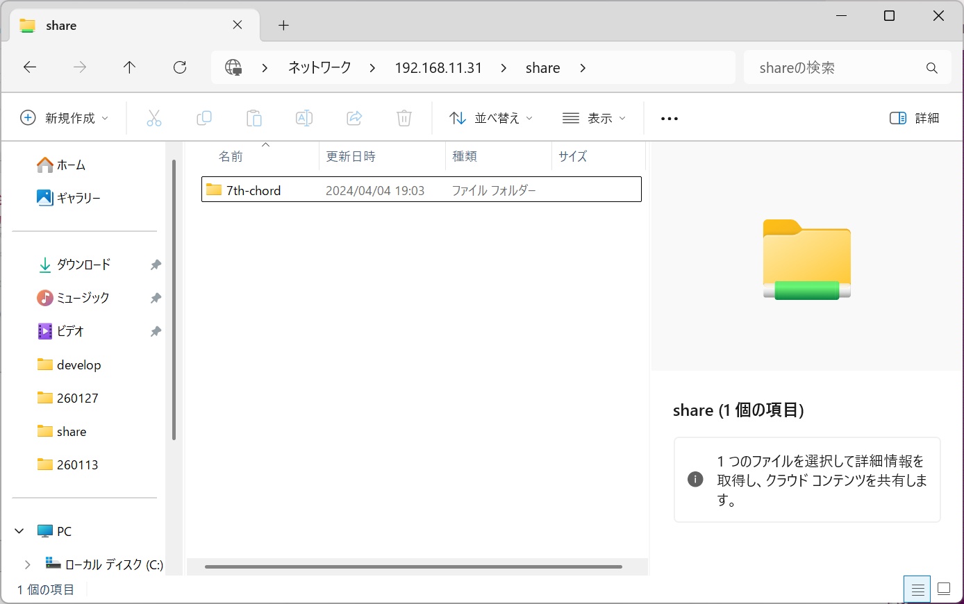 ファイルエクスプローラーのアドレスバーにIPアドレス + 共有名を入力します