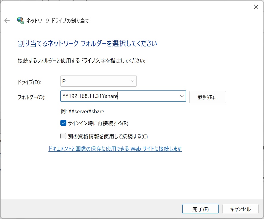 ここでは、共有フォルダ―をEドライブに割り当てています