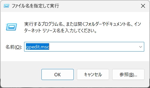 Win + Rで「ファイル名を指定して実行」を開き、「gpedit.msc」と入力してローカルグループポリシーエディターを起動します。