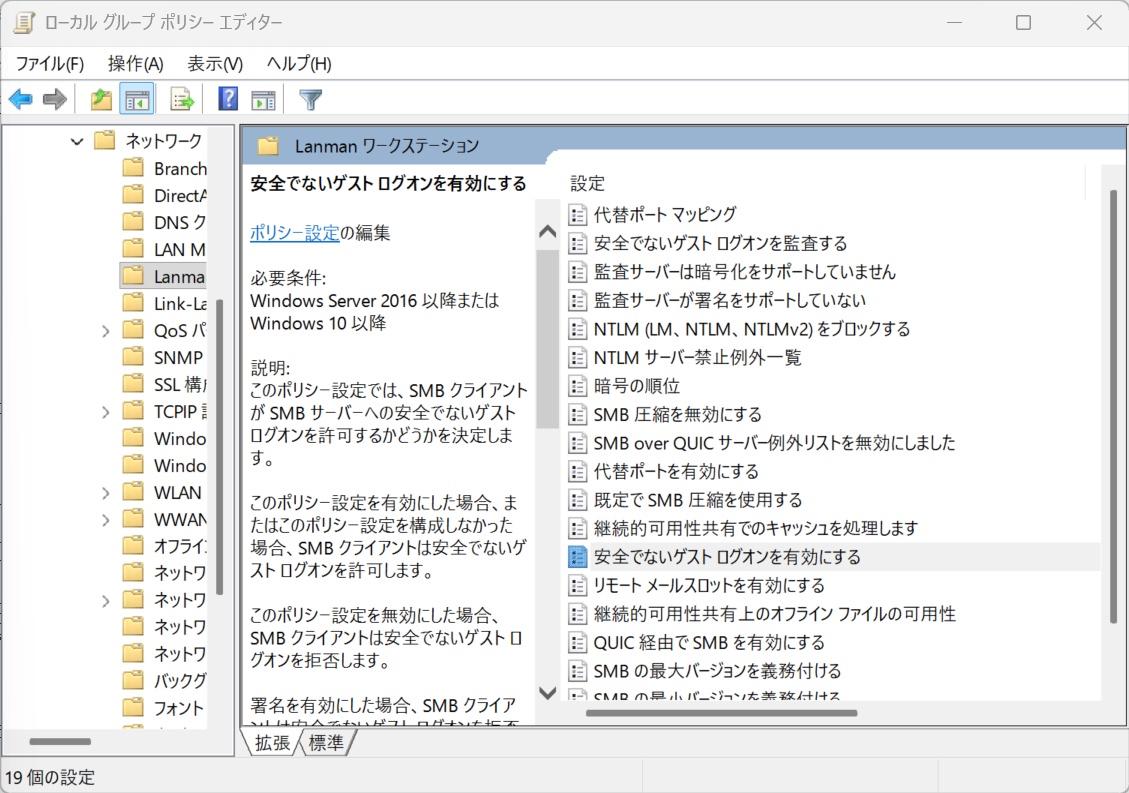 コンピューターの構成 > 管理用テンプレート > ネットワーク > Lanman ワークステーション を開きます。