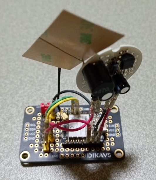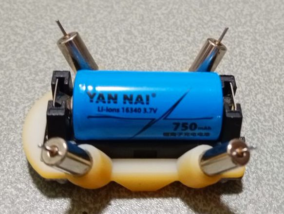 空中に浮いているのは3.7V、16340リチウムイオン電池を5Vに昇圧するモジュールです。