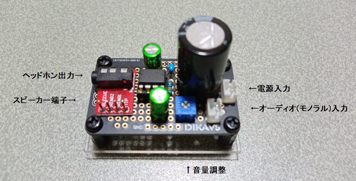 最小で4個の外付け部品(VR×1個、コンデンサー×3個)でアンプを構成できます。