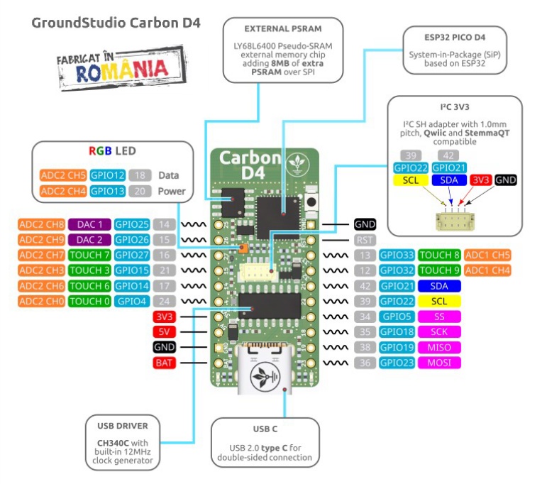 PSRAMを実装していて、malloc()が使えるESP32 Pico D4マイコンです。